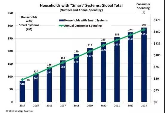 據通信行業和消費科技市場研究機構Strategy Analytics報告稱,智能家居設備的需求量將在未來五年內超過智能手機。其中,今年增長最快的智能家居產品類別將是智能音箱,其預計增長率為109%,將達到6900萬臺。