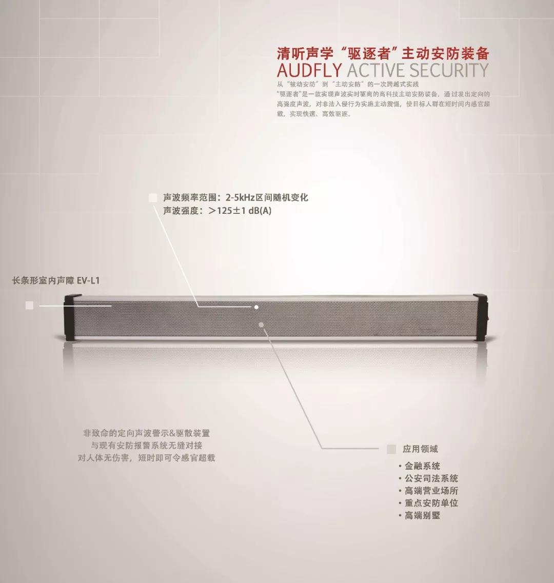 第一款是基于聲波技術實現遠/近驅離的主動安防裝備,名為“驅逐者”。顧名思義,“驅逐者”通過發射定向高強度聲波,短時間內使非法入侵者感官超載,在事中階段實現快速驅逐,有效延緩犯罪,降低事件破壞力,是新一代的聲學高科技安防手段。