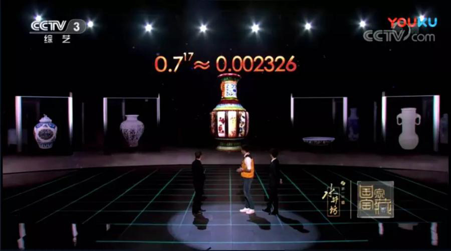 前世故事讓人捧腹,大瓶的今生故事則讓人瞠目。故宮號稱“問不倒”的講解員張甡把大瓶上的各種釉彩從上到下17種釉彩、紋樣以及燒制的溫度介紹了一遍,然后給大家算了算,燒成這樣一件大瓶的成功率:假設(shè)將每一種釉彩的成功率往高了算,按70%算,17種釉彩同時完美燒制的概率: