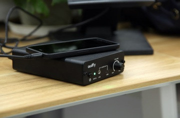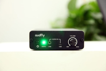 功放盒子,采用金屬機身,配合黑色噴砂陽極氧化工藝,品質感十足,前面有電源鍵、指示燈、Audio in接口(音頻線和USB數據線均可接入)、音量旋鈕;后面是電源接口和Audio輸出接口;底部四個角各有1個防滑硅膠墊。