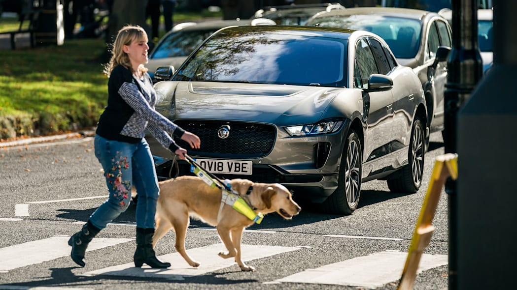 一輛電動汽車(Jaguar i-Pace)的駕駛員等待一名帶著導盲犬的婦女穿過斑馬線。圖片由Flickr提供。